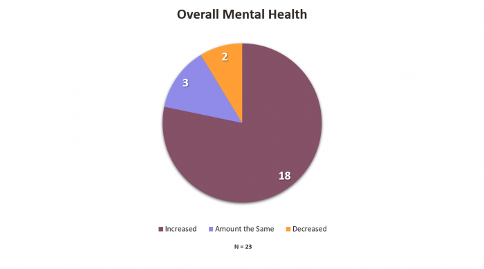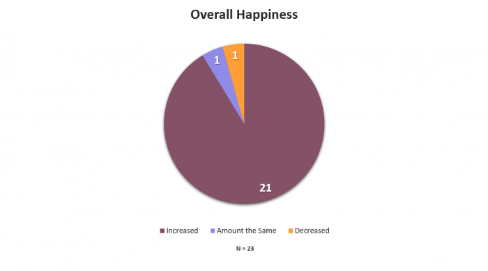 We didn’t stop at housing, though. An important part of the transitional housing program was to conduct Quality of Life surveys with participants 3 months post housing. One of the major questions we sought to answer was ‘did the participant’s quality of life increase due to housing?’ These surveys help us further enhance future programs to make sure they are making the right kinds of impact. Thus far, we have received 23 survey responses, and it is evident that quality of life was increased due to housing – participants’ outlook on life also improved.